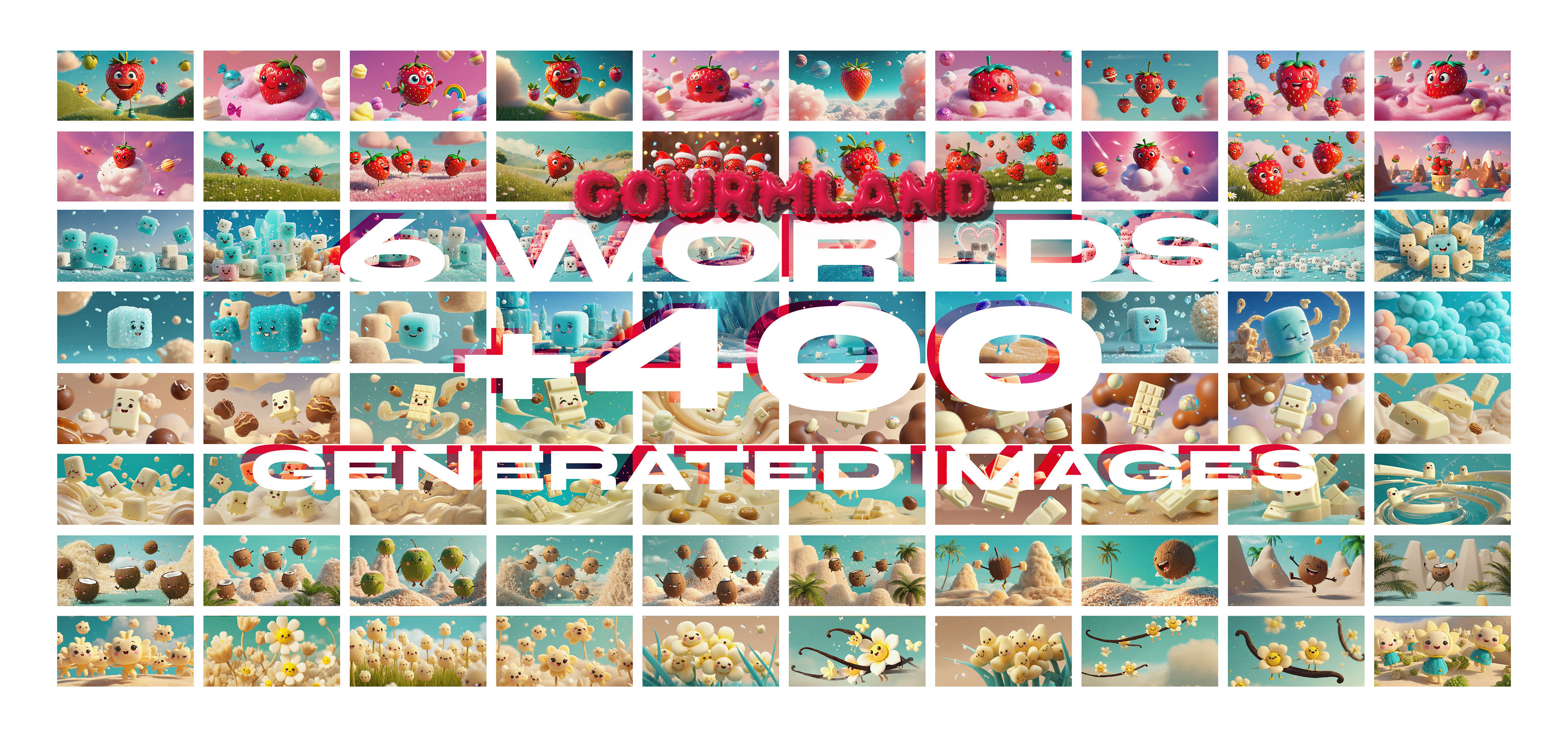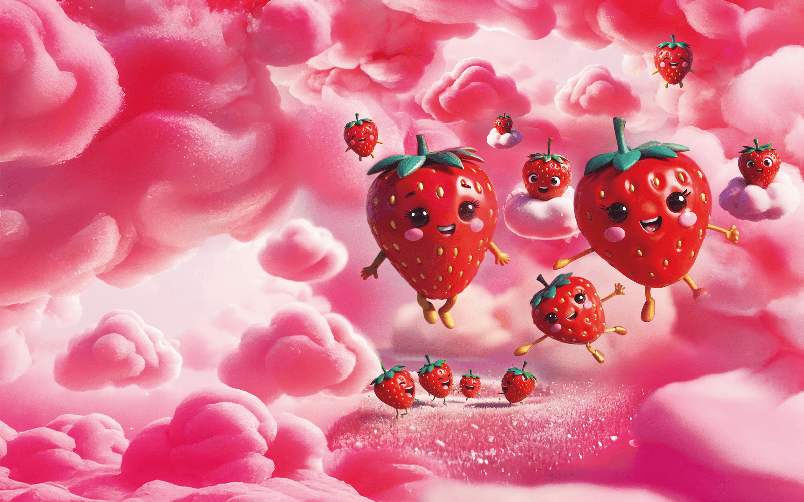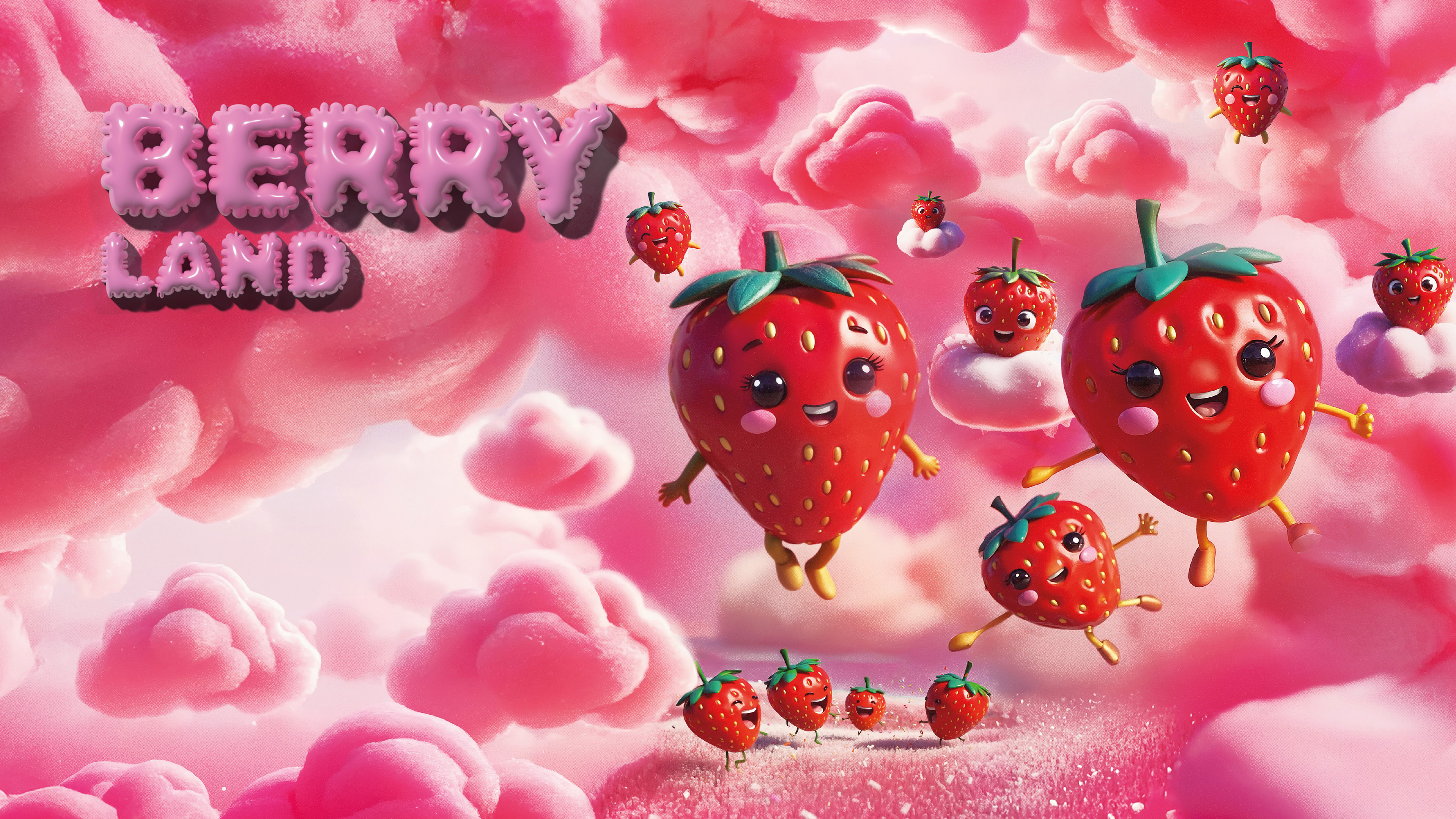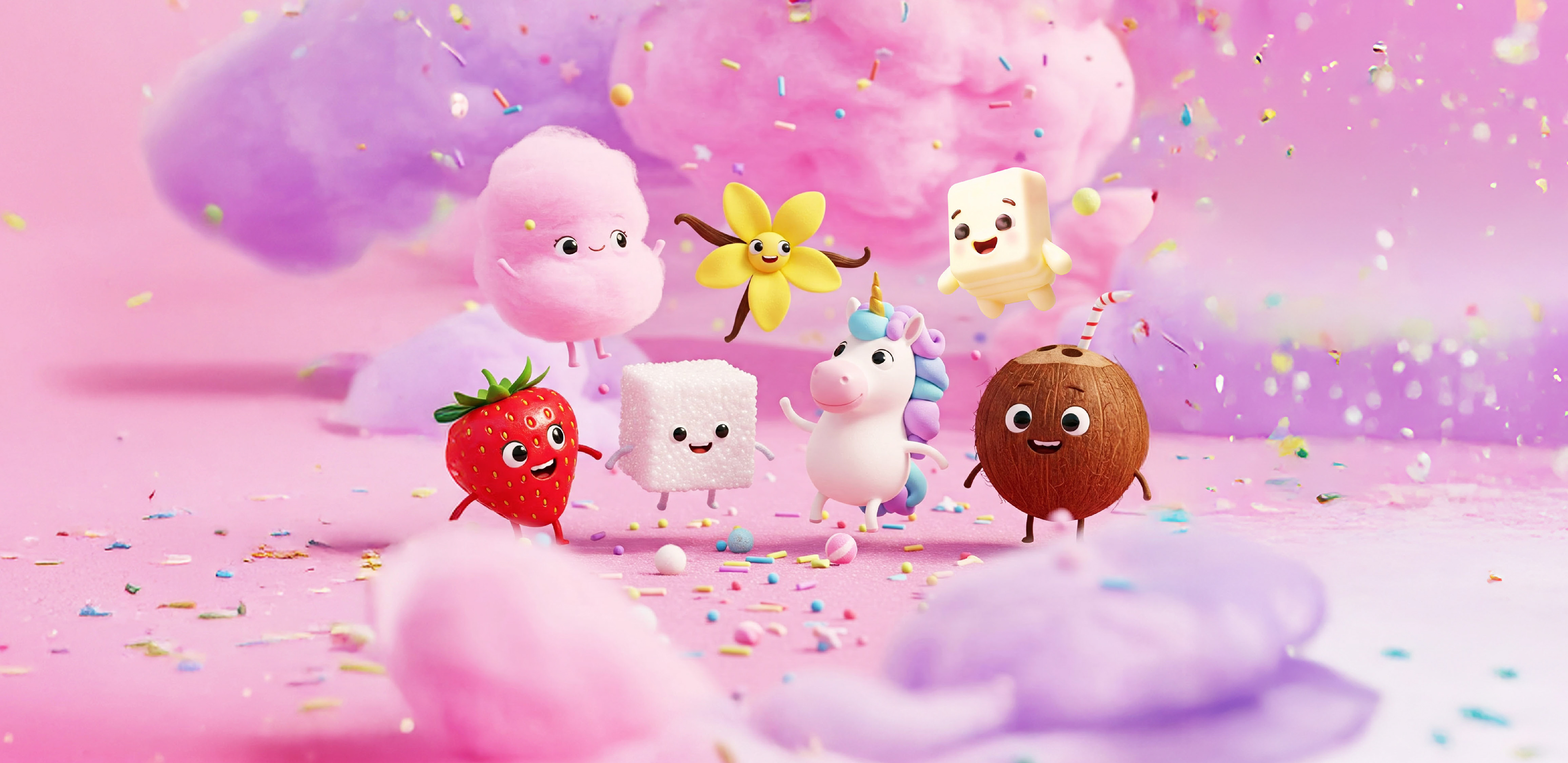 The heart of the project lies in character development. We moved away from traditional 2D aesthetics to embrace a cinema-inspired 3D Look Dev. Anthropomorphic strawberries, cotton candy creatures, and fantastic beings were modeled with obsessive care for volume and texture: "touchable" softness, glossy reflections, and warm lighting. This treatment gave the subjects a vibrant personality and an instant "legacy" feel.