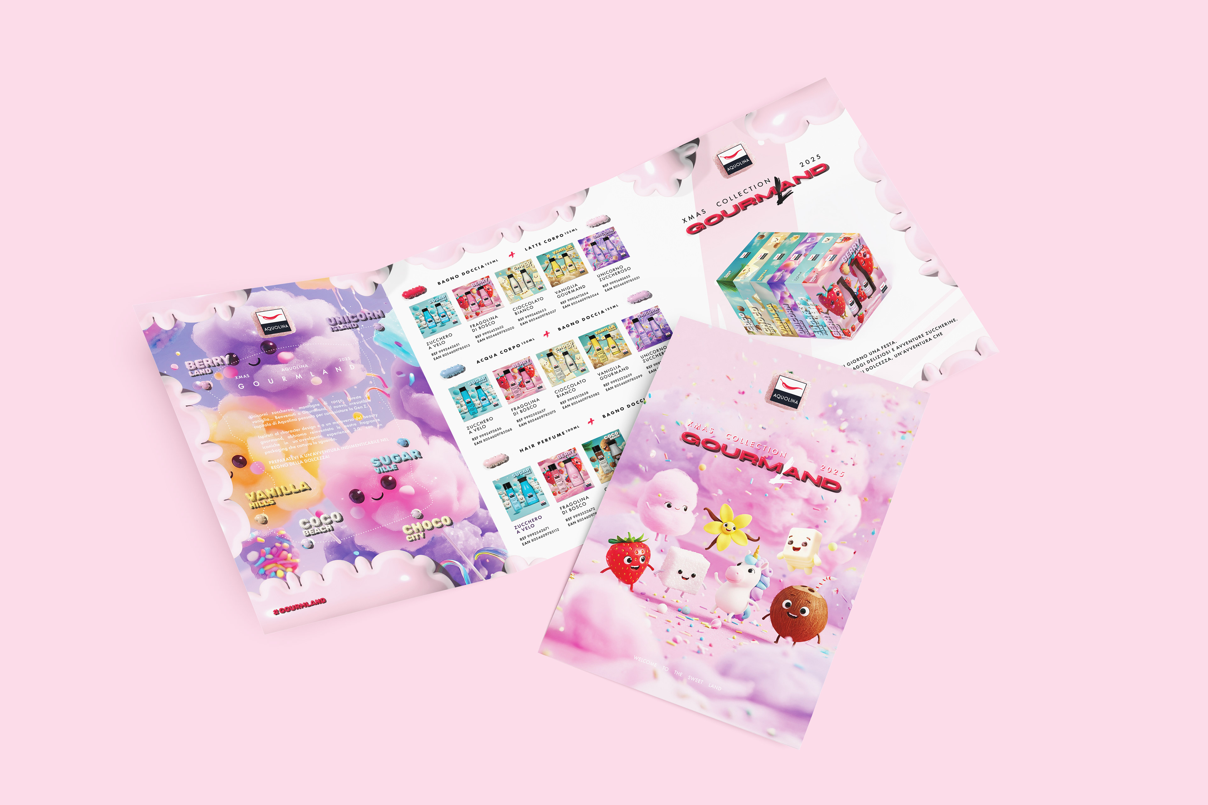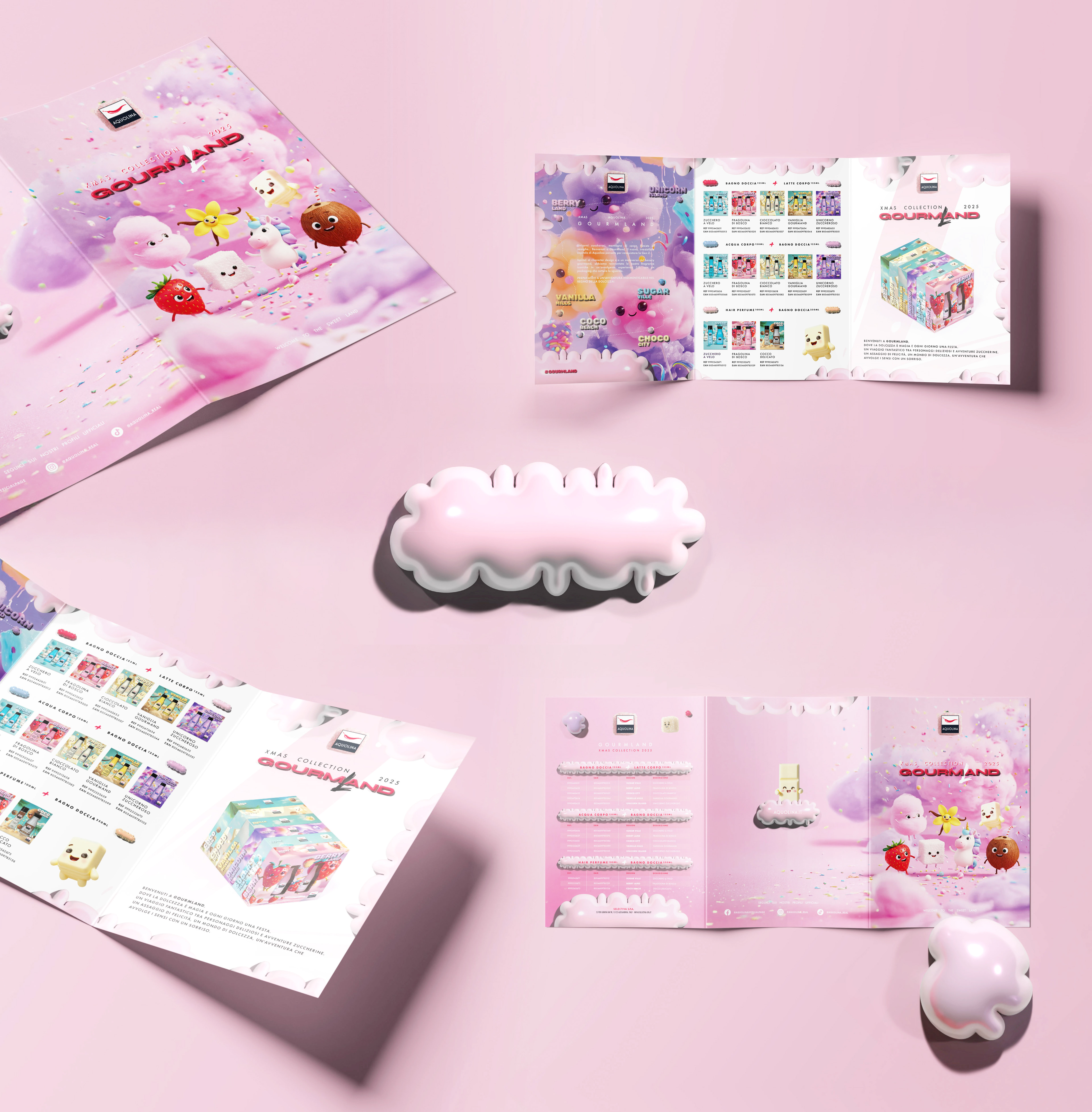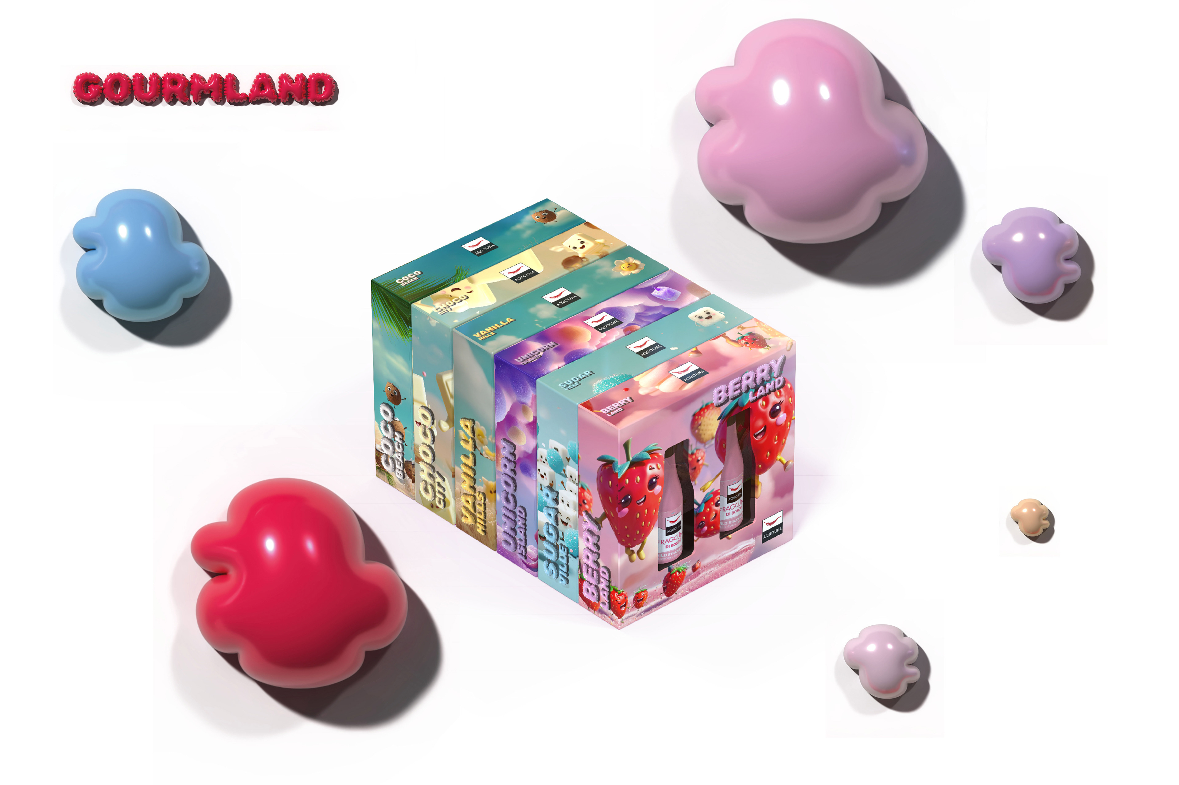 The process began with the definition of a strong semantic identity. "Gourmland" is more than a name; it’s a statement of intent that combines Aquolina’s olfactory expertise (the gourmand world) with a playful, geographical dimension. Each reference was mapped as a district within this world: from Berry Land and Unicorn Island to Vanilla Hills. This approach allowed us to give a "place" and a story to every fragrance, transforming the catalog into a true map of taste.