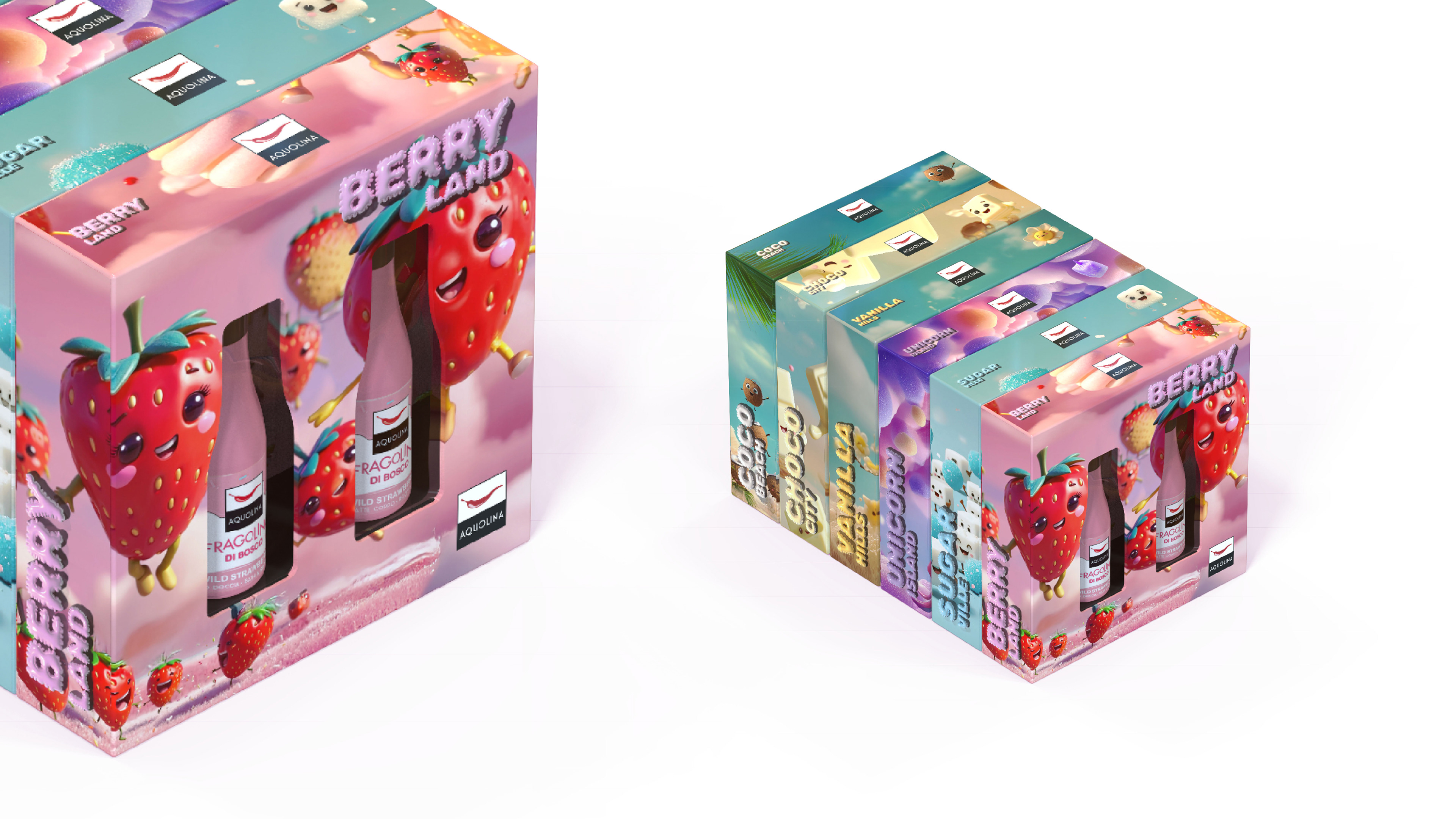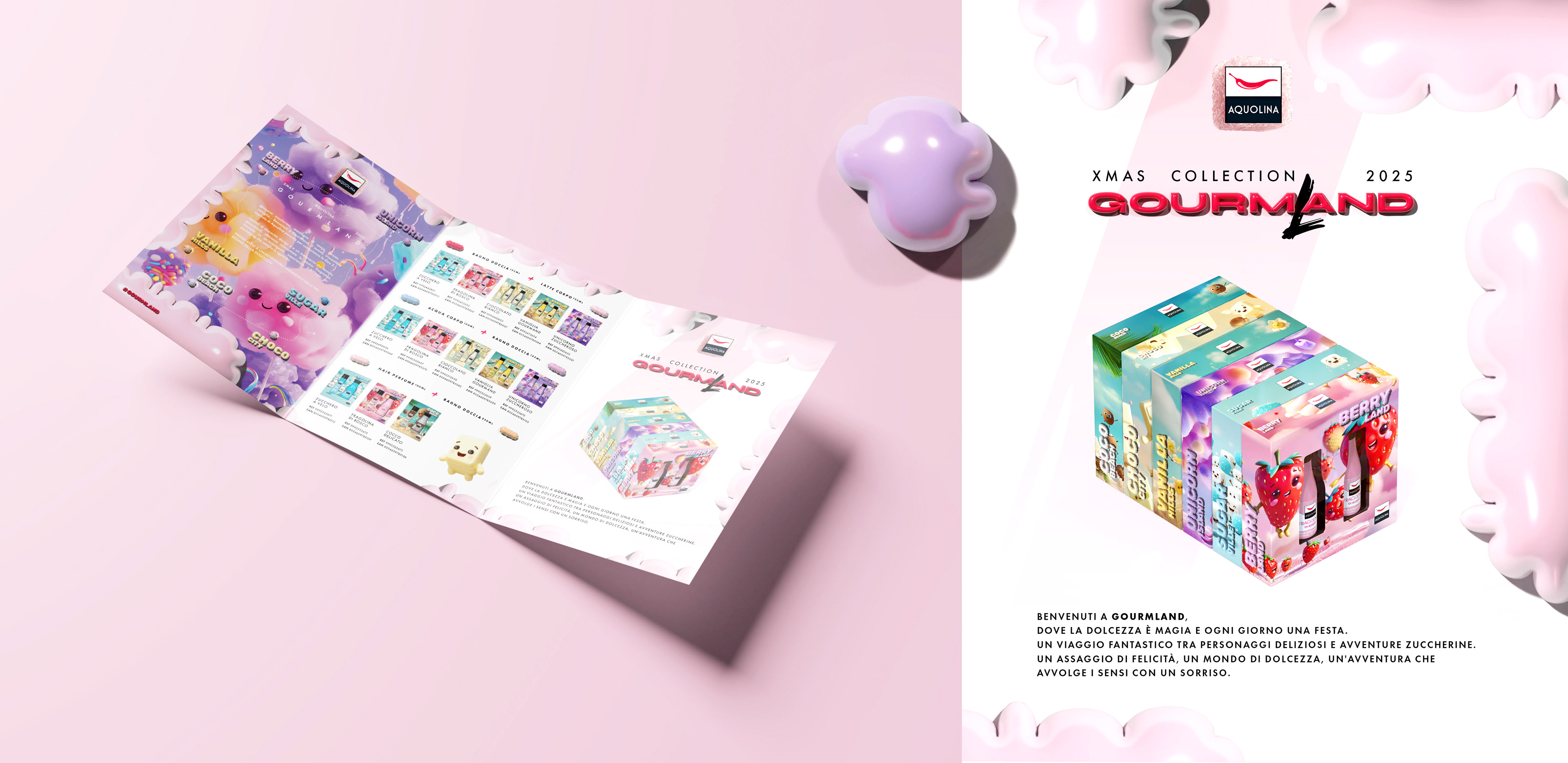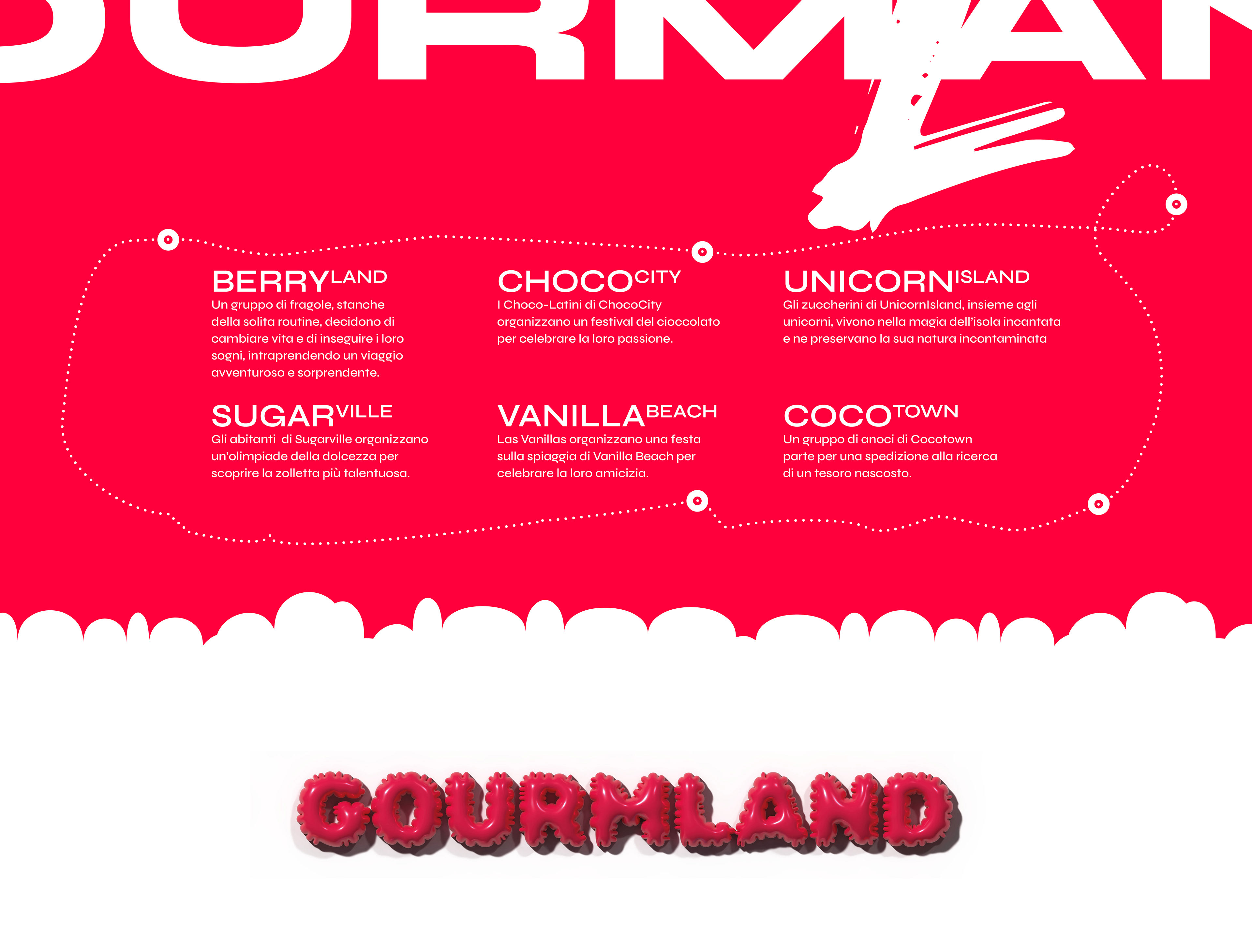 The process began with the definition of a strong semantic identity. "Gourmland" is more than a name; it’s a statement of intent that combines Aquolina’s olfactory expertise (the gourmand world) with a playful, geographical dimension. Each reference was mapped as a district within this world: from Berry Land and Unicorn Island to Vanilla Hills. This approach allowed us to give a "place" and a story to every fragrance, transforming the catalog into a true map of taste.